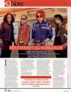 This is a single page article from 'Q' magazine, This article is a little basic but is simply read and has a clean layout so is nice overall. The main image is of what is a band and they seem to be standing looking quite aggressive almost trying to intimidate, the use of there clothing such as leather coats, glasses shows of a sense of quite rocky presence as if they are hiding there identity with the glasses but showing they mean business when it comes down to it with the coats.you can see also from the peoples hairstyles that they would not be an everyday typical pop band as they do not looked dress or represented that way, they seem to be quite punk/rock orientated. The main cover line of this is showing the band off and trying to gain the band some publicity, this is an effective way of getting your name around as it shows you off for all that you are and what you show as a band. There is a masthead which is very basic showing off the magazines name and says 'Now' this could show that this band is doing well and they are in at the moment and this is the most important news, is what the people want to know off and what is happening with them. There is no sub image on this page. I like the layout of the cells on this page as it may be very basic it is also easy to understand, people could find this attractive as it looks very clean, meaning people may find that it looks more mature so will have better content to it. The colors which are used in this article seem to be red, white and black. These colors seem to feature within most music magazines and seem to attract a better audience as it is attractive and gives of a nice look to the page, it is soft to the eye so it doesn't stand out to much and is a nice shade so is easy to read.